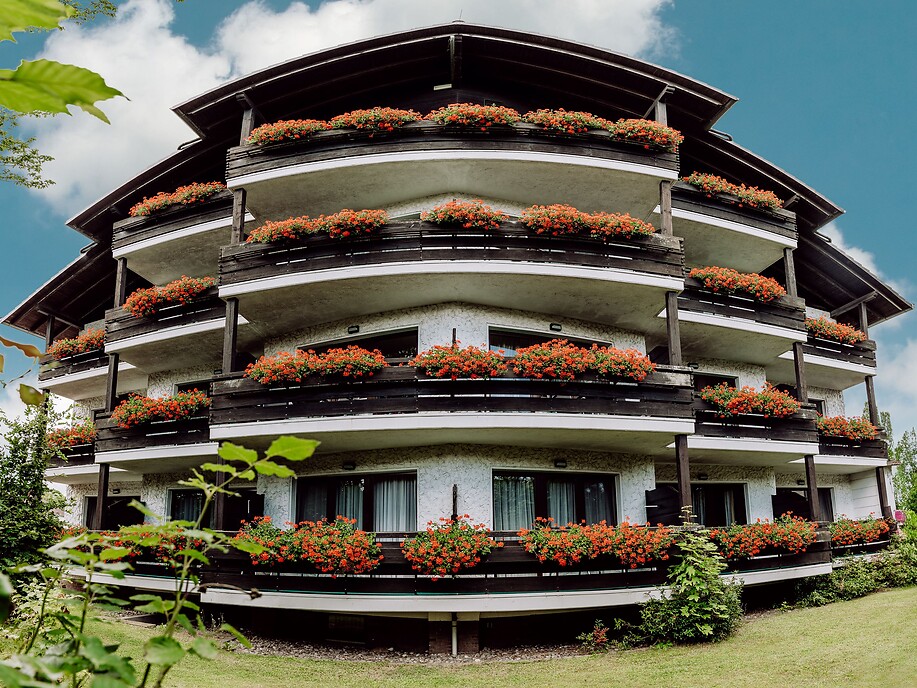 Eingebettet in eine weitläufige Gartenanlage besteht unser Hotel aus drei miteinander verbundenen Häusern.