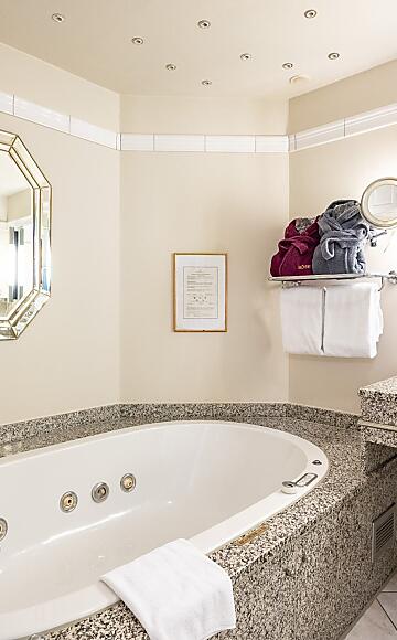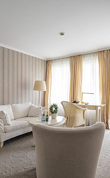 The room has a spacious south-facing balcony, a bathroom with shower and bathtub, four-poster bed or canopy, separate living room, hairdryer, make-up mirror, fluffy bathrobe and towelling slippers as well as a TV, digital guest folder and safe.