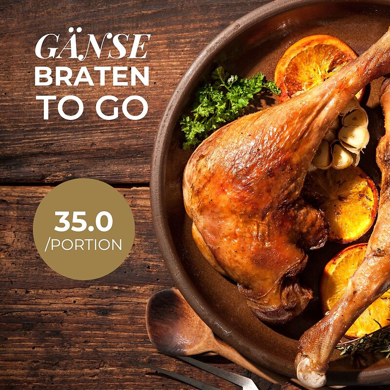 Enjoy our traditional roast goose from regional free-range farming not only in the restaurant, but also in the comfort of your home. The goose is pre-prepared in our kitchen and finished by you at home. It comes with dumplings, red cabbage, an apple–almond stuffing and our aromatic sauce.