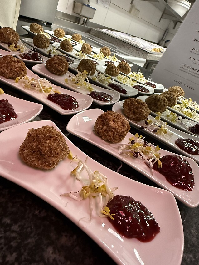 The culinary theme of the evening was Goose & More. As is tradition at our Kitchen Party, guests found themselves right in the middle of the action: standing in the kitchen while meat was seared, vegetables simmered and plates were prepared. The individual components offered a varied selection, allowing everyone to taste their way through the evening according to their own preferences.